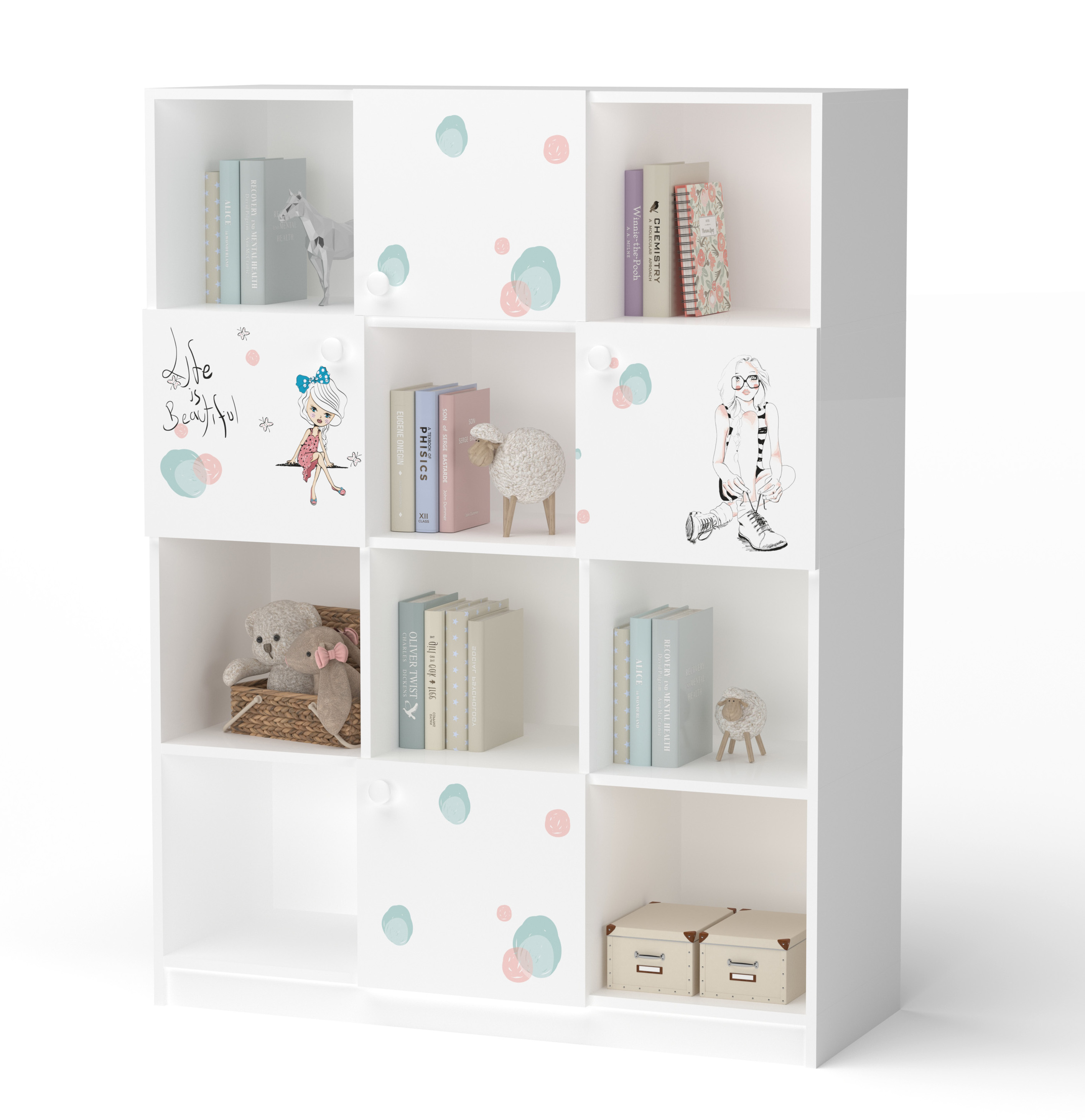 Етажерку можна використовувати як окремий предмет меблів або як перегородку між спальною та ігровою зоною. У ній є як закриті, так і відкриті полиці, а це не тільки зручно у використанні, а й красиво.