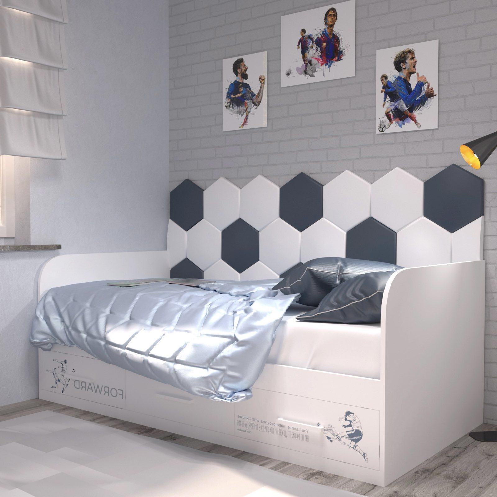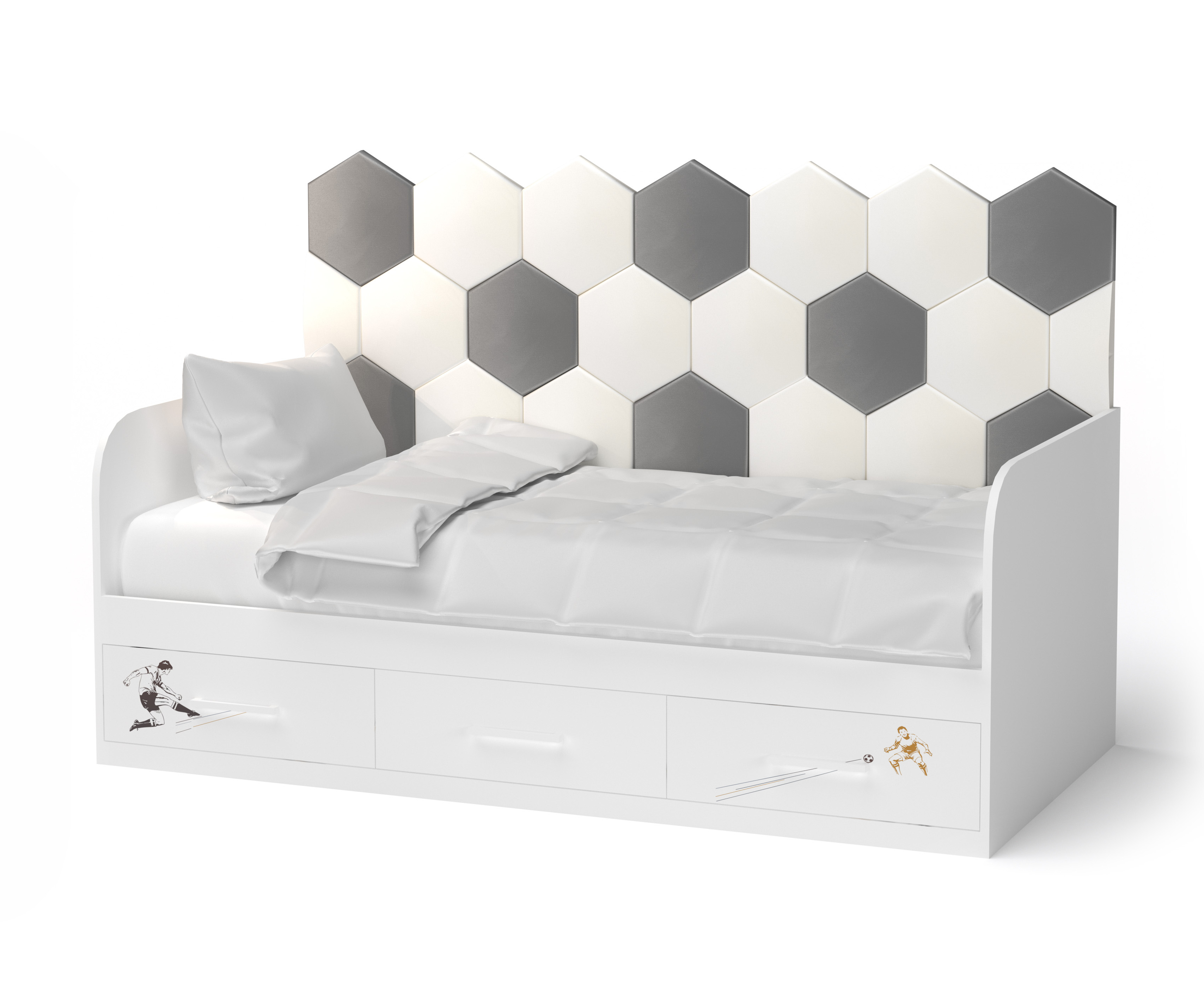 Модель ліжка «Соти» прикрасить кімнату хлопчика. На такому ліжку затишно не тільки спати, а й сидіти, спираючись на м'яку спинку. А в шухлядах під ліжком зручно зберігати потрібні речі.