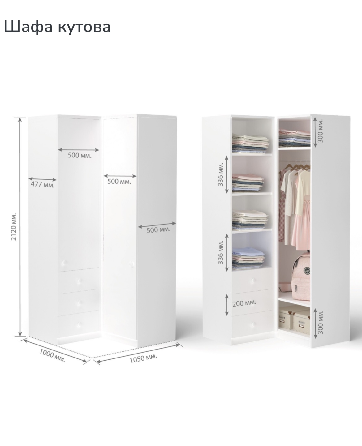 • Наповнення - три шухляди, полички та труба під вішала.