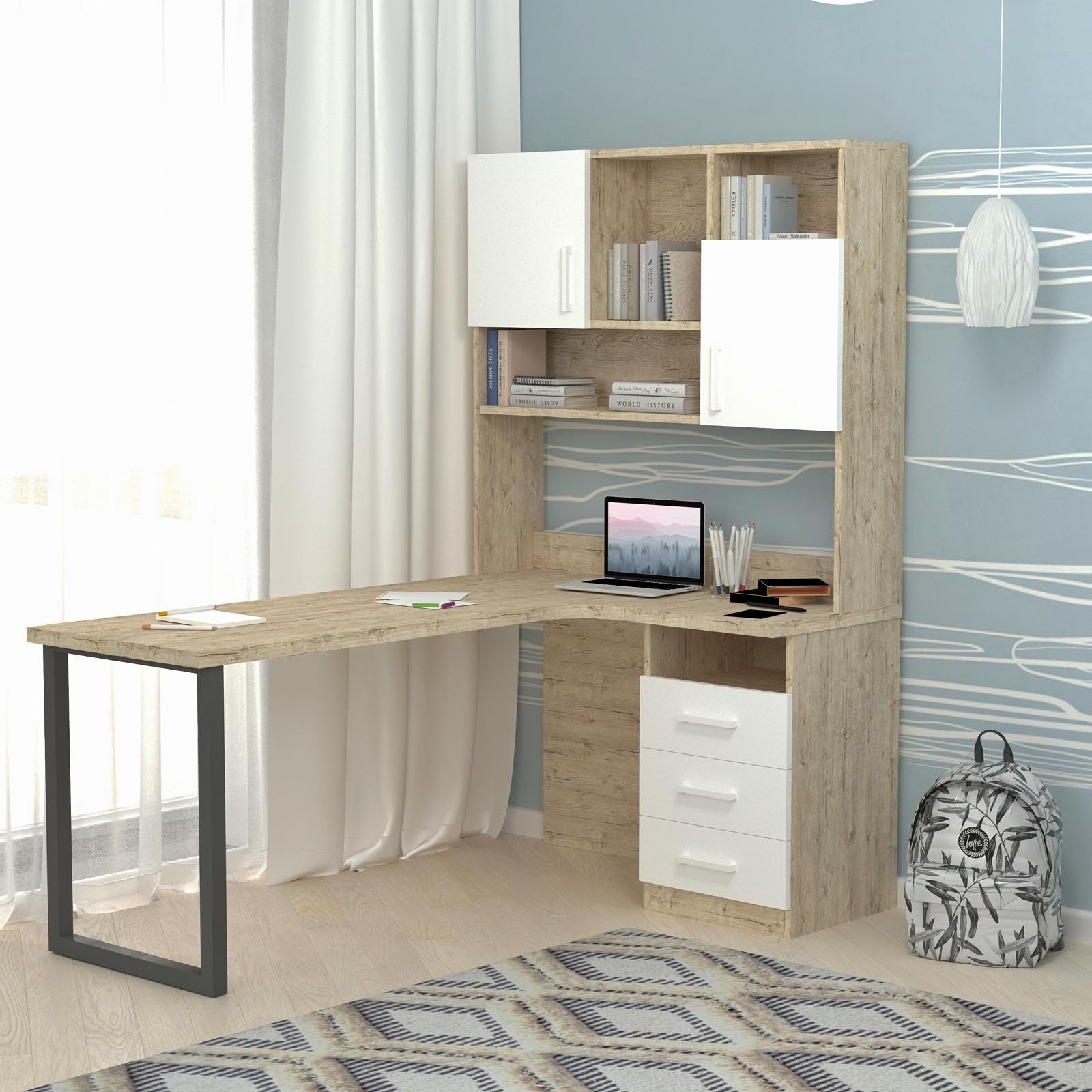 Письмовий стіл з кутовою стільницею та надбудовою буде дуже зручним для розміщення всього шкільного приладдя, матеріалів для творчості та хобі вашої дитини. А велика стільниця дозволить зручно розмістити на столі все необхідне.