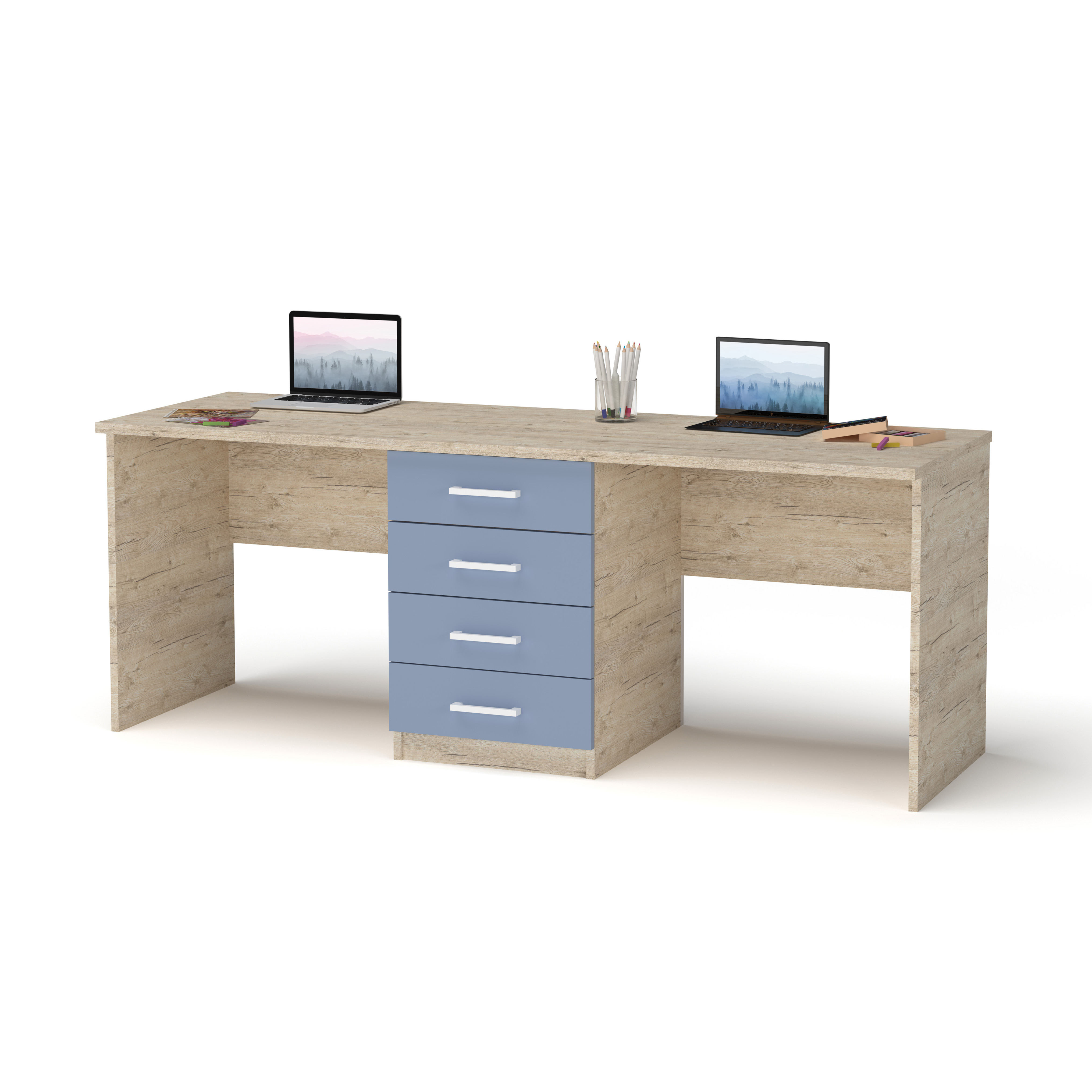 Письмовий стіл із широкою стільницею та чотирма шухлядами буде комфортним і в той же час компактним місцем для навчання двох дітей та зберігання їх шкільного приладдя.