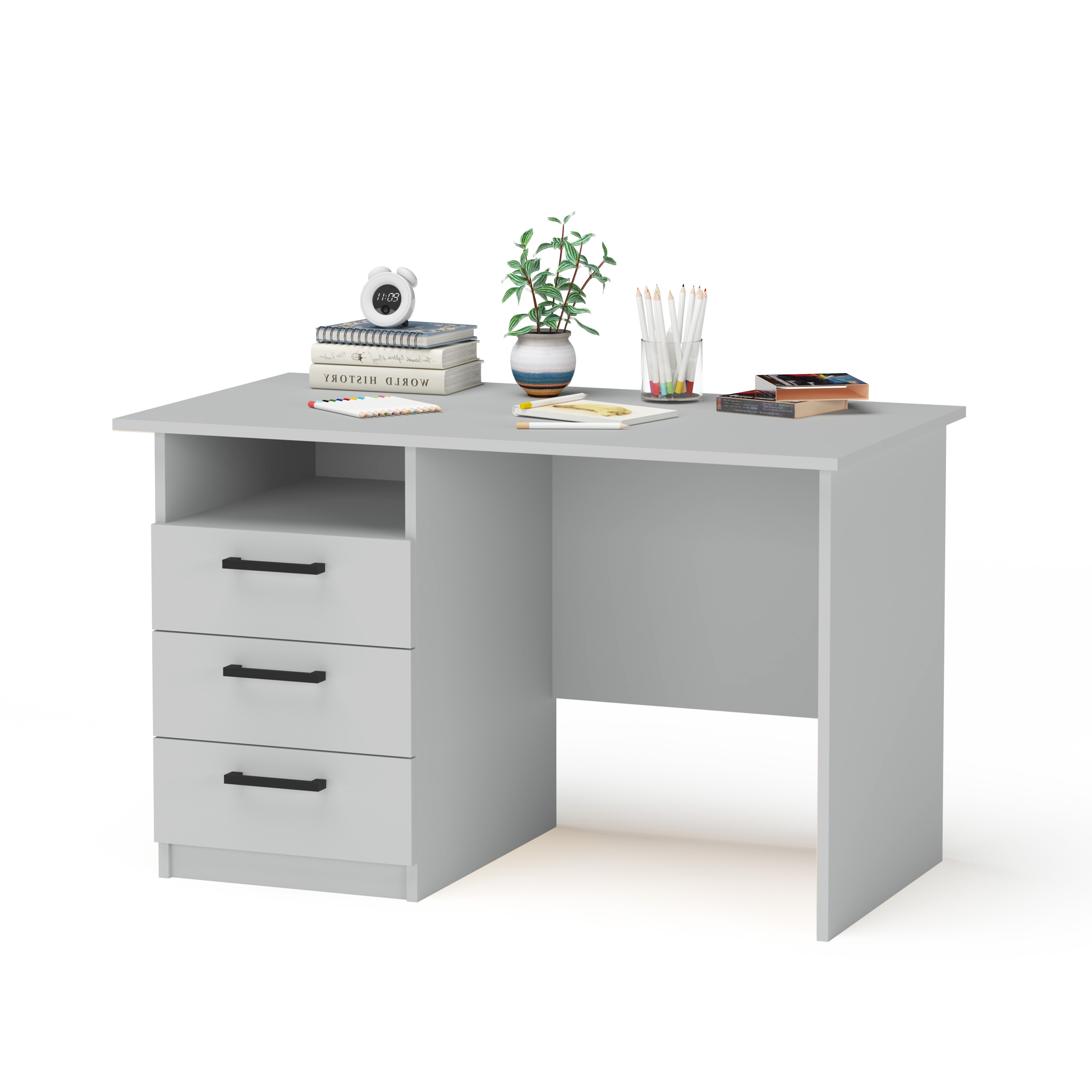 Письмовий стіл із широкою стільницею та трьома зручними шухлядами буде компактним і в той же час комфортним місцем для навчання вашої дитини та зберігання її шкільного приладдя.