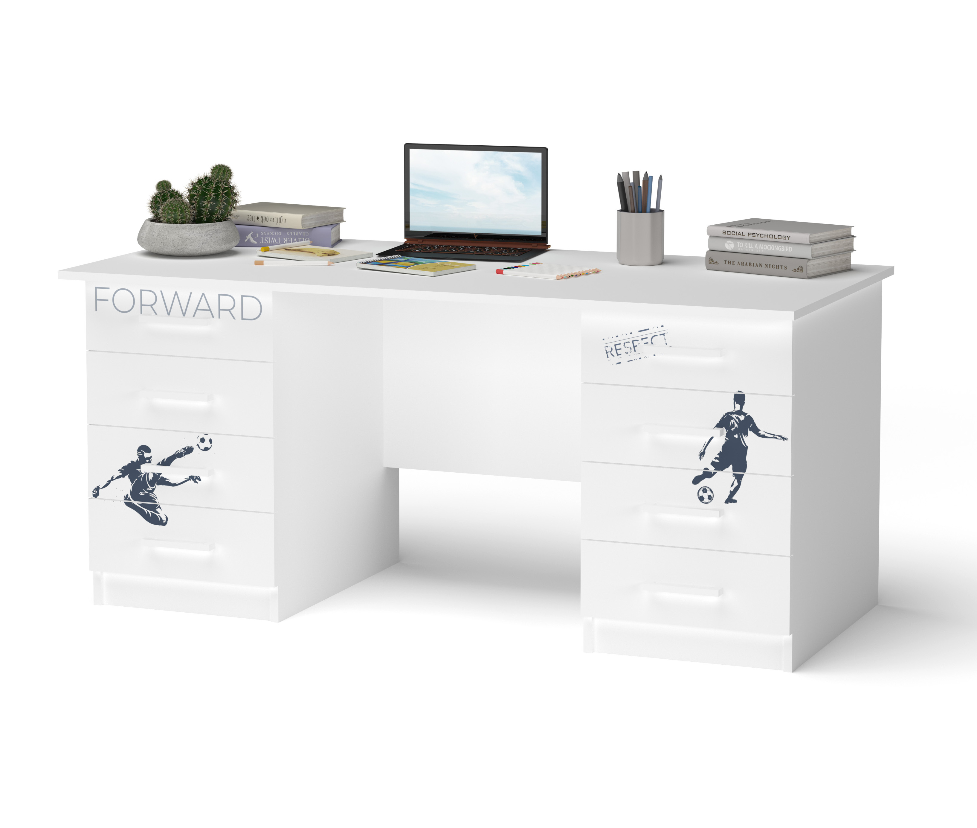 Письмовий стіл з широкою стільницею та двома тумбами. В кожній тумбі по чотири шухляди.