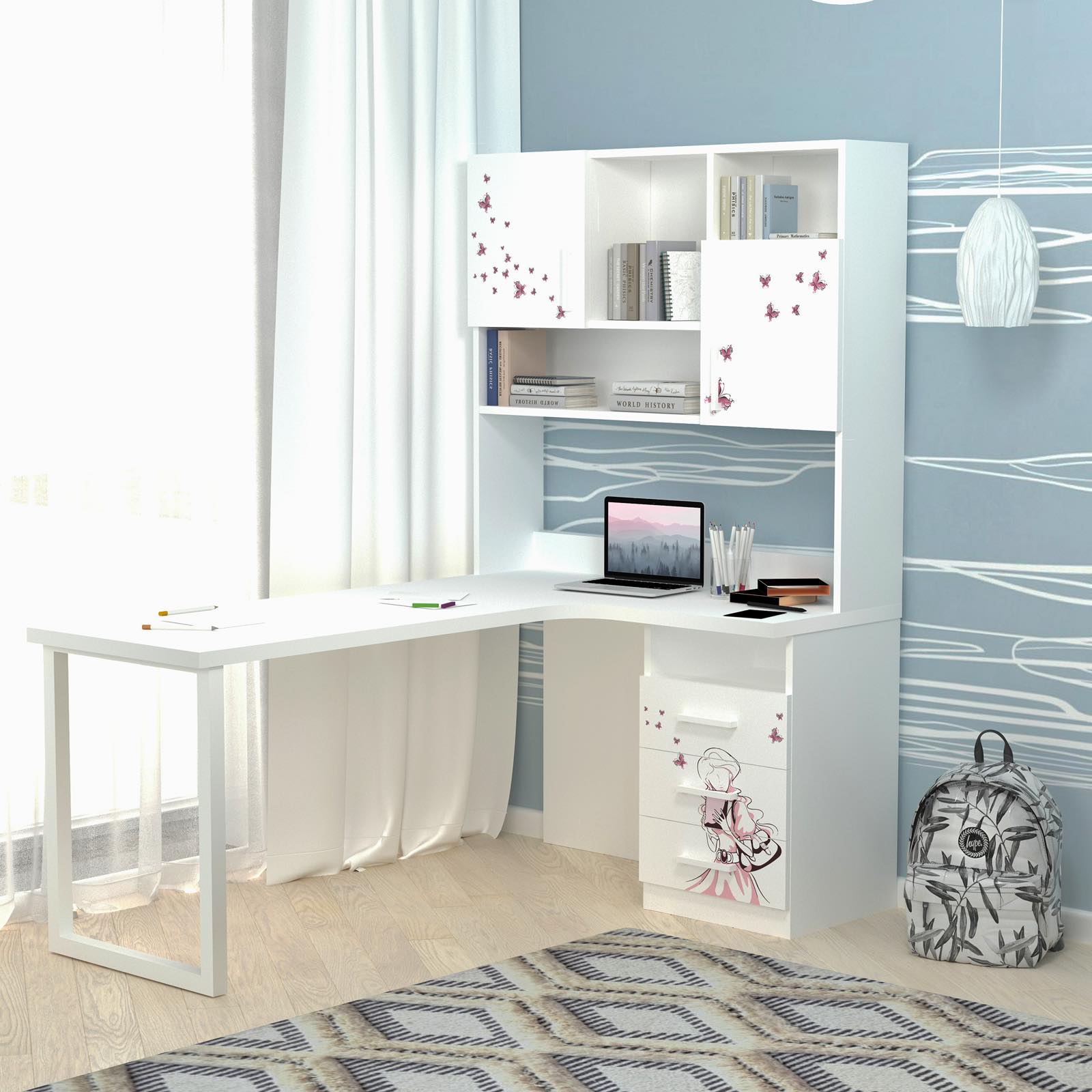 Письмовий стіл з кутовою стільницею та надбудовою буде дуже зручним для розміщення всього шкільного приладдя, матеріалів для творчості та хобі вашої дитини. А велика стільниця дозволить зручно розмістити на столі все необхідне.