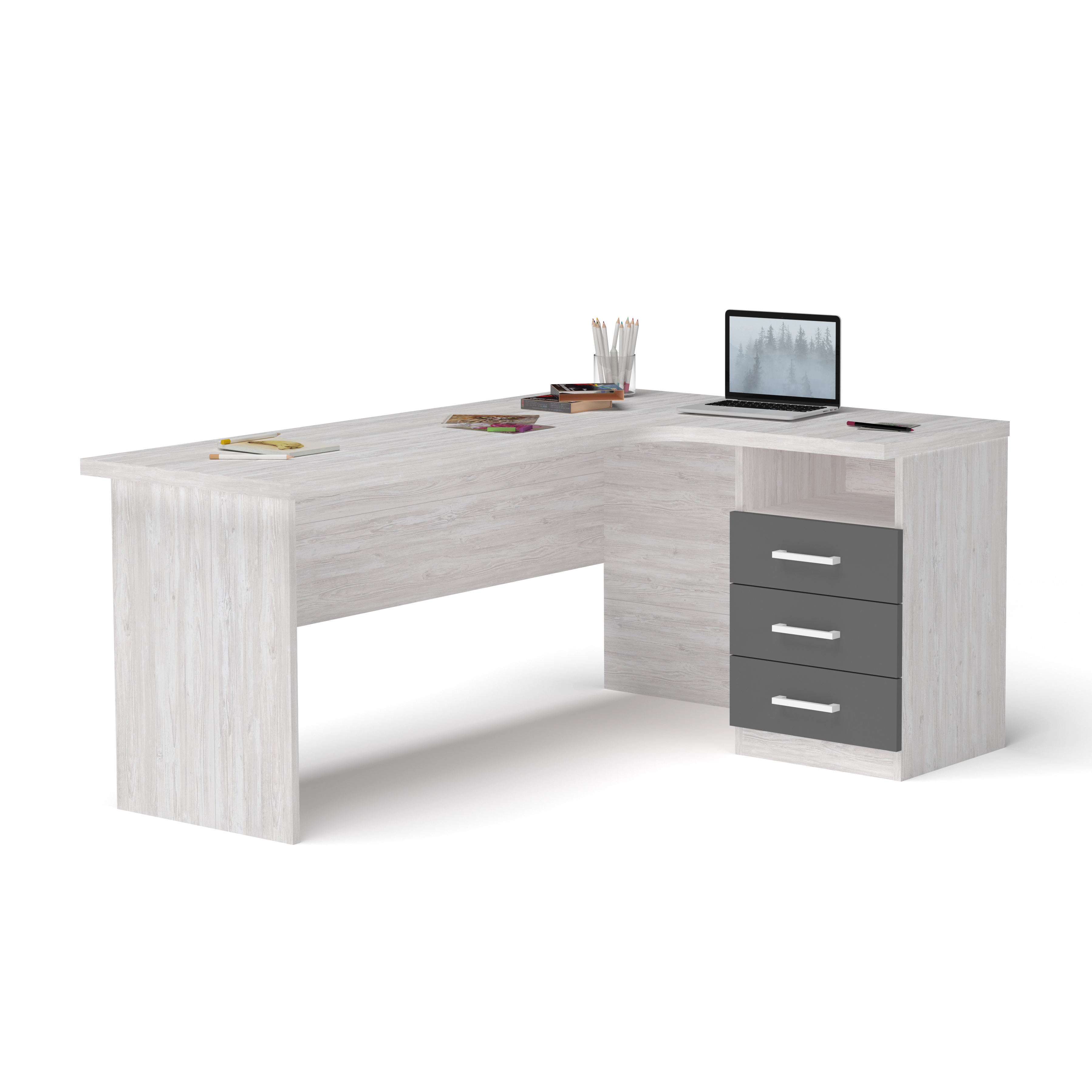 Письмовий стіл з великою кутовою стільницею та тумбою з трьома шухлядами буде зручним рішенням для навчання вашої дитини та зберігання її шкільного приладдя.