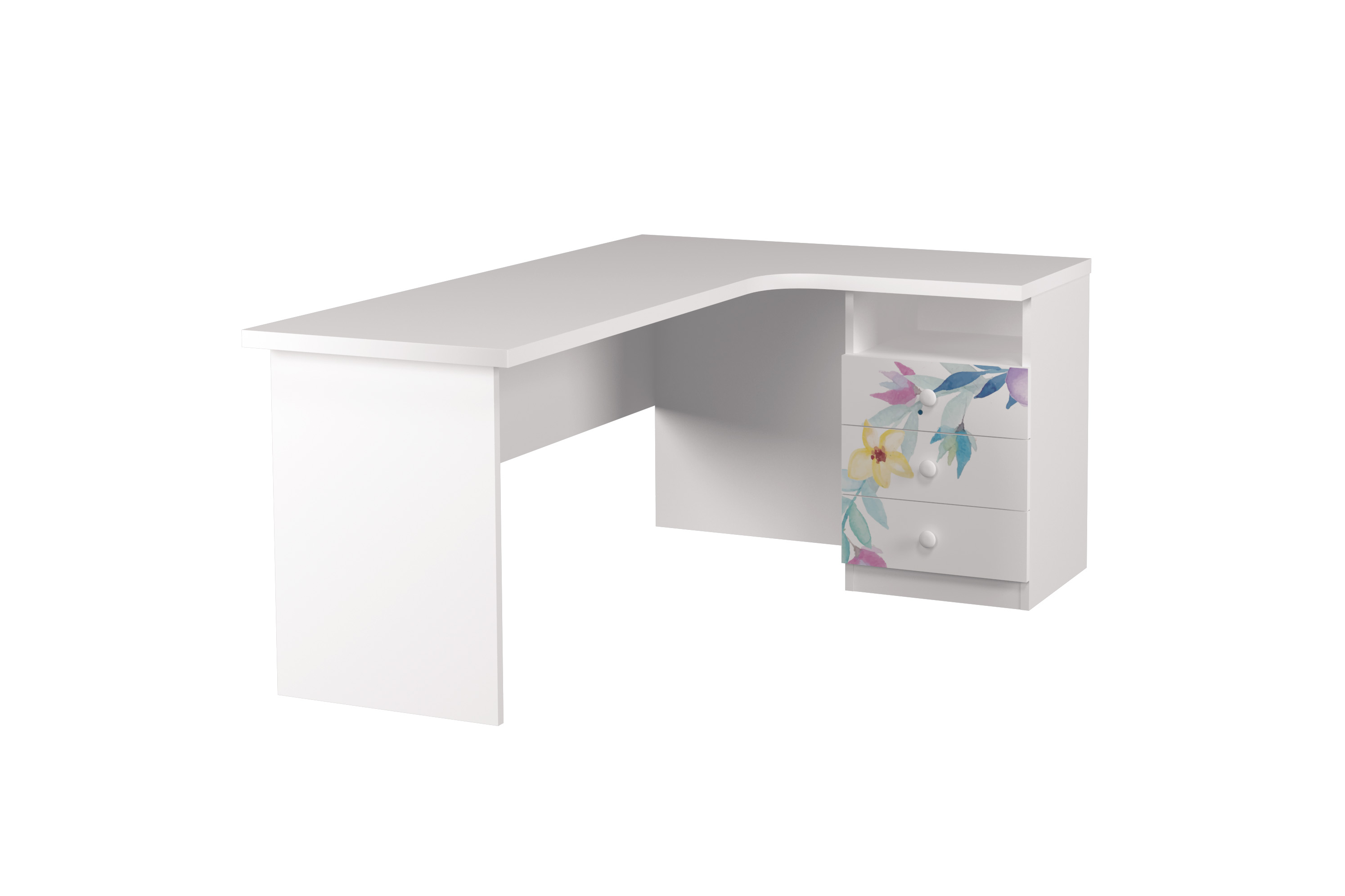 Письмовий стіл з великою кутовою стільницею та тумбою з трьома шухлядами буде зручним рішенням для навчання вашої дитини та зберігання її шкільного приладдя.