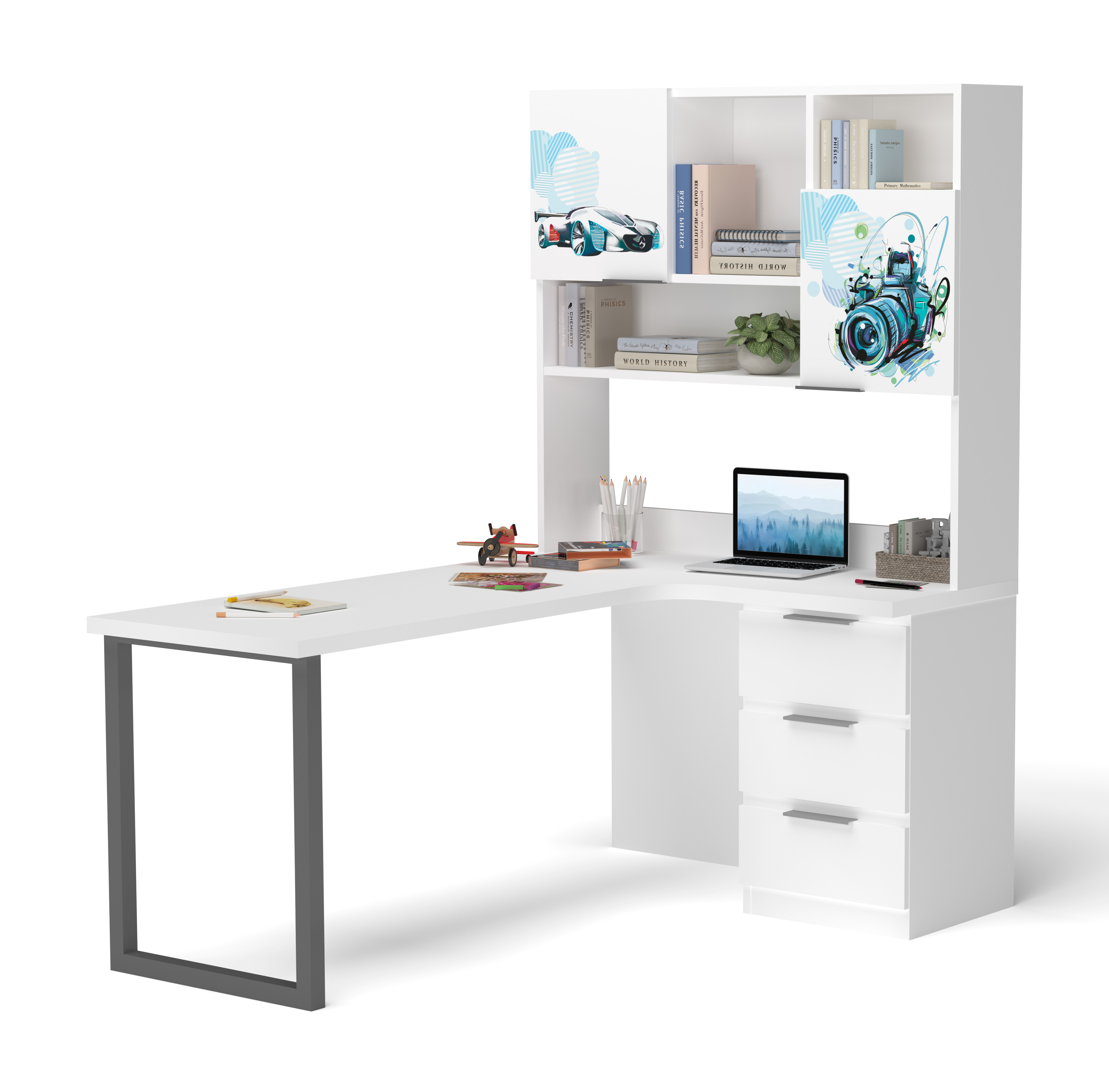 Письмовий стіл з кутовою стільницею та надбудовою буде дуже зручним для розміщення всього шкільного приладдя, матеріалів для творчості та хобі вашої дитини. А велика стільниця дозволить зручно розмістити на столі все необхідне.