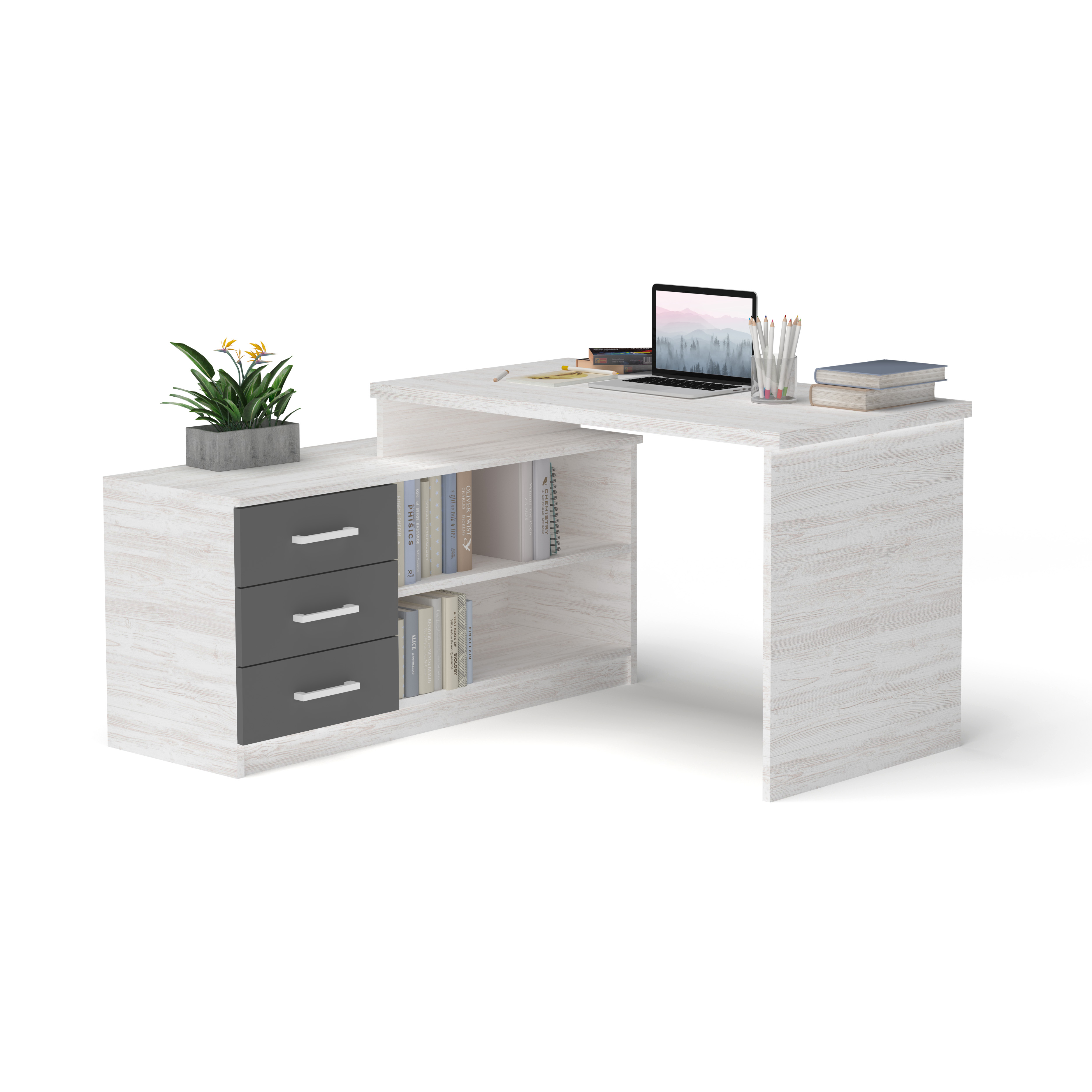 Письмовий кутовий стіл зі стільницею на двох рівнях, тумбою з поличками та трьома шухлядами буде оригінальним та зручним рішенням для зберігання шкільного приладдя, та матеріалів для творчості вашої дитини.