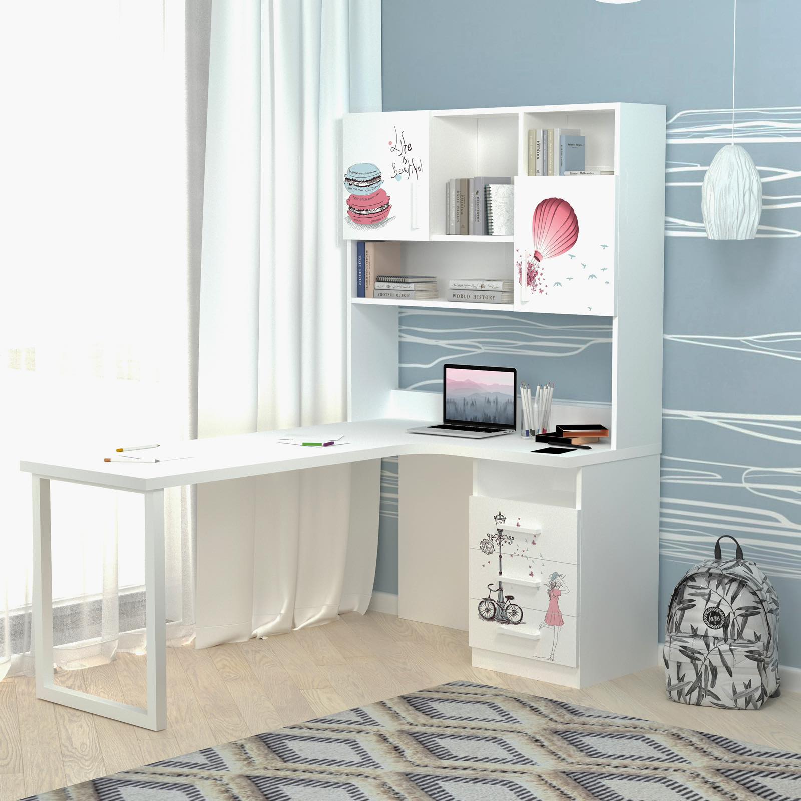 Письмовий стіл з кутовою стільницею та надбудовою буде дуже зручним для розміщення всього шкільного приладдя, матеріалів для творчості та хобі вашої дитини. А велика стільниця дозволить зручно розмістити на столі все необхідне.